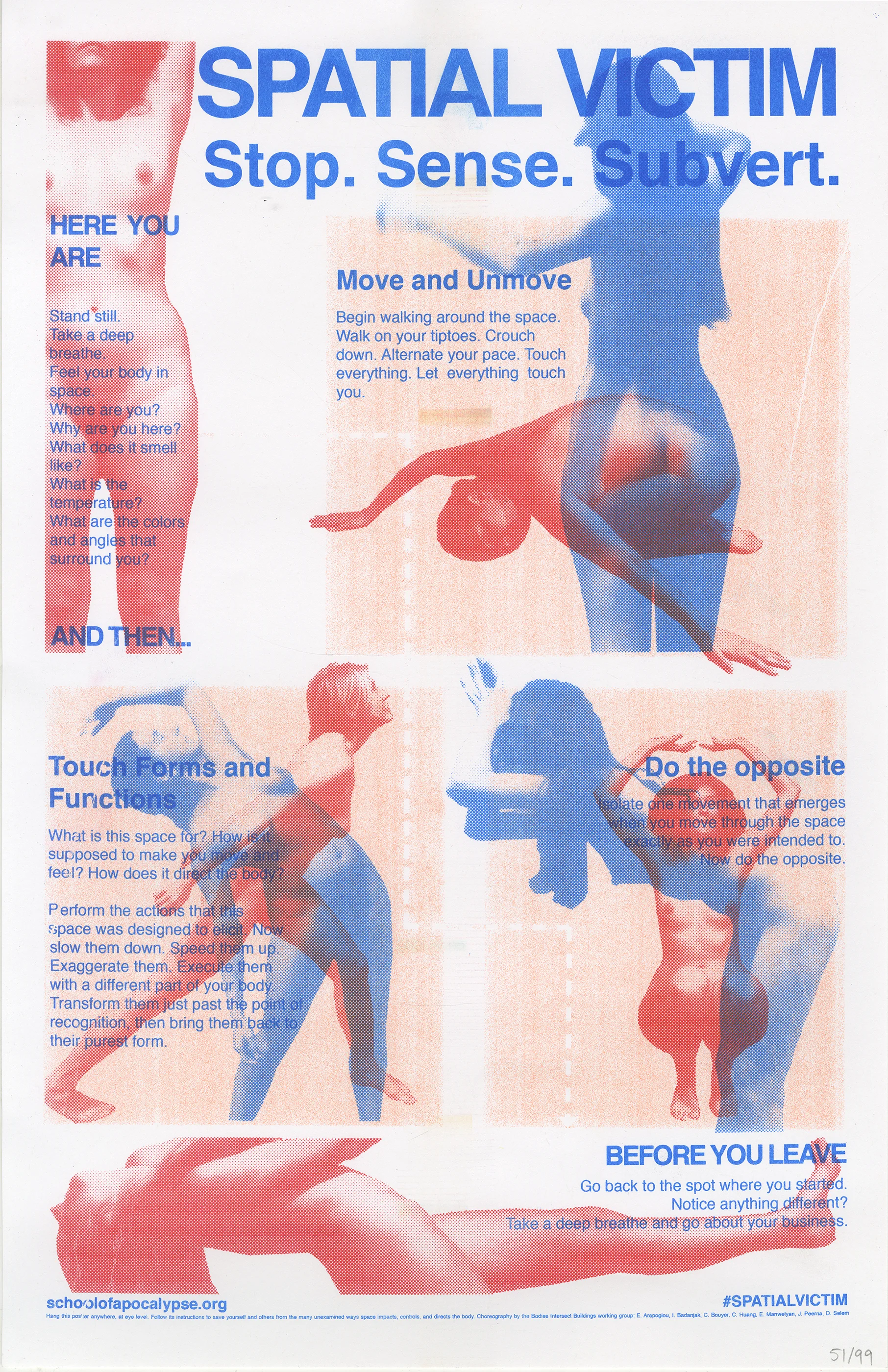 In its first iteration the group created a choreography, written as a series of instructions on a poster ("Spatial Victim") inspired by the ever-present choking victim posters hung up in restaurants and public spaces. This choreography is designed to give people tools to connect with and investigate this peripersonal space. Ultimately, we hope to engage a practice of growing our embodied power and agency by not falling victim to mindlessly obeying the instructions inherent in a space.